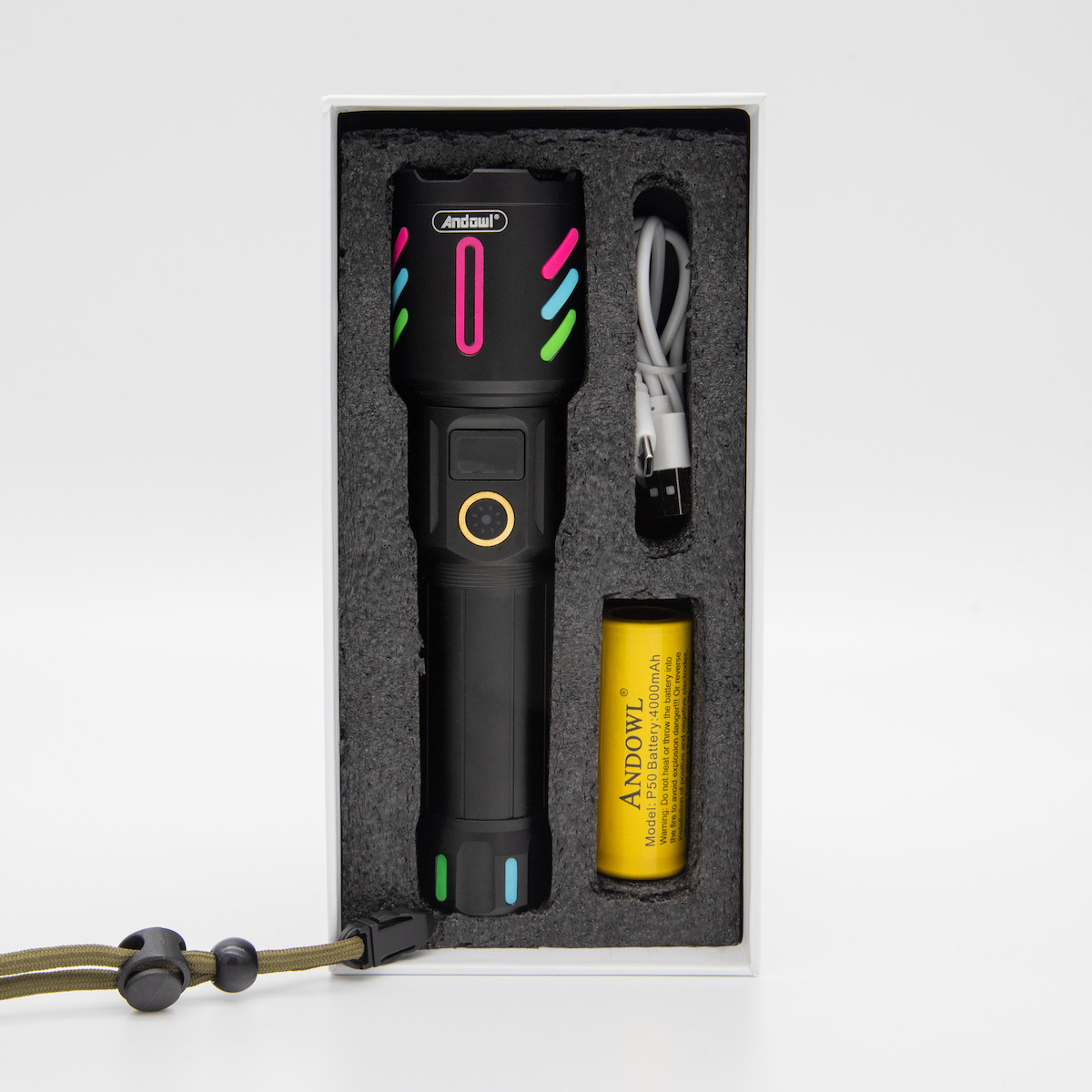 Φακός LED χειρός της Andowl, κατάλληλος για χρήση σε δραστηριότητες όπως κατασκήνωση, πεζοπορία, ποδηλασία, κυνήγι και ψάρεμα.