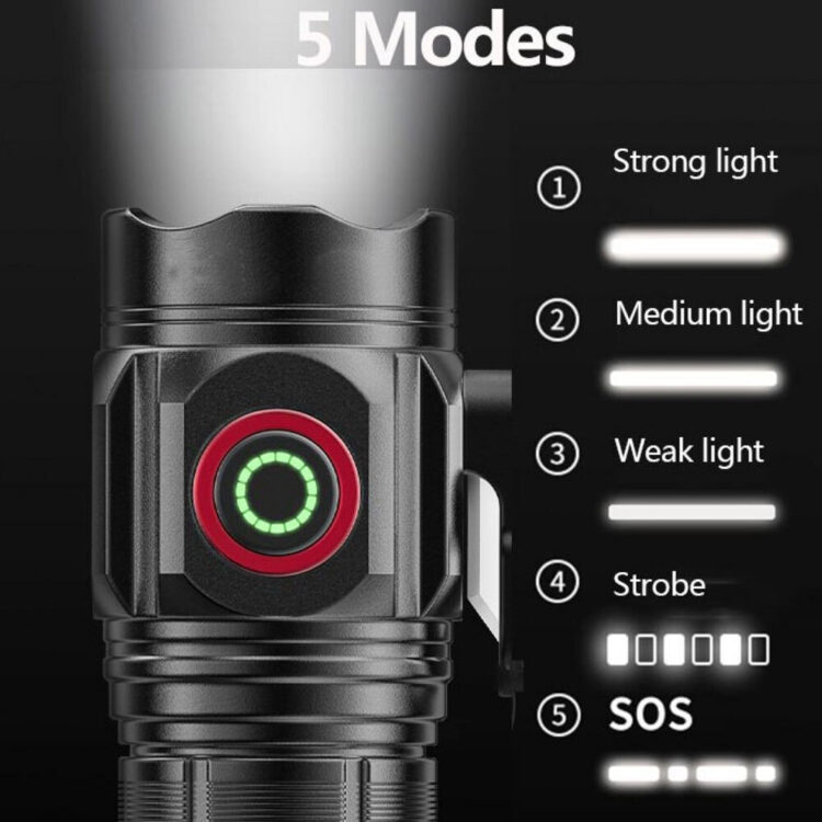 5 Φακός με λειτουργίες φωτός: Διαθέτει 5 λειτουργίες (υψηλή, μεσαία, χαμηλή, στροβοσκοπική και SOS) που ενεργοποιούνται με το πάτημα ενός κουμπιού. Η απόσταση φωτισμού μπορεί να φτάσει έως και τα 200μ.