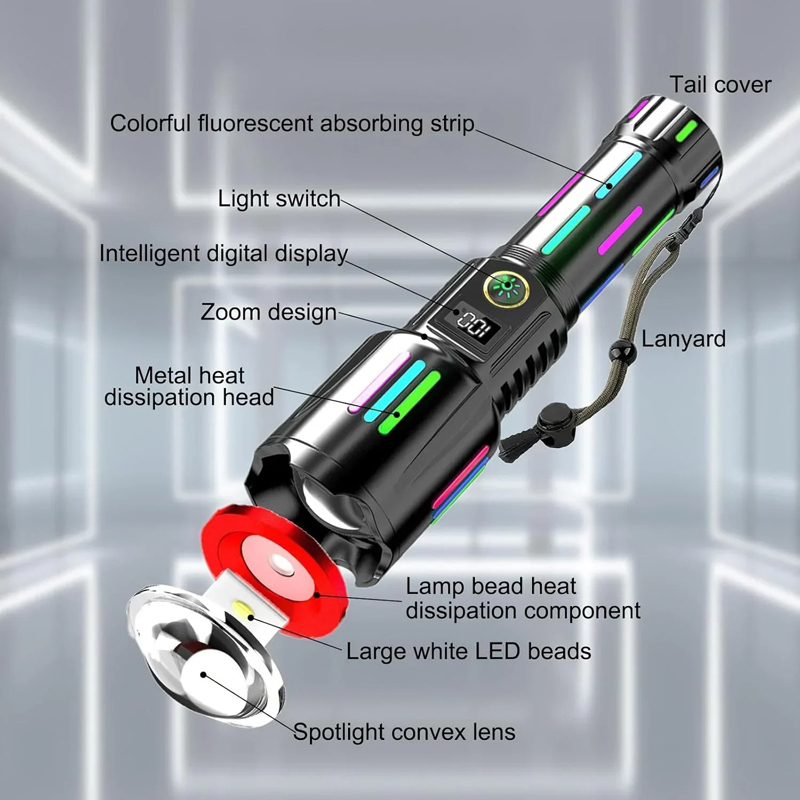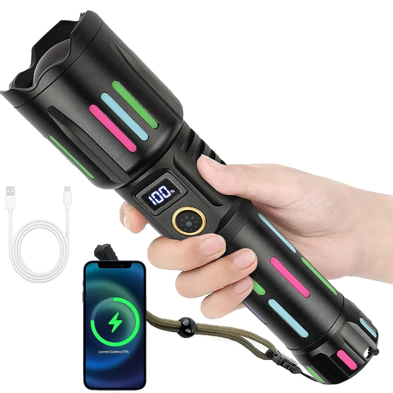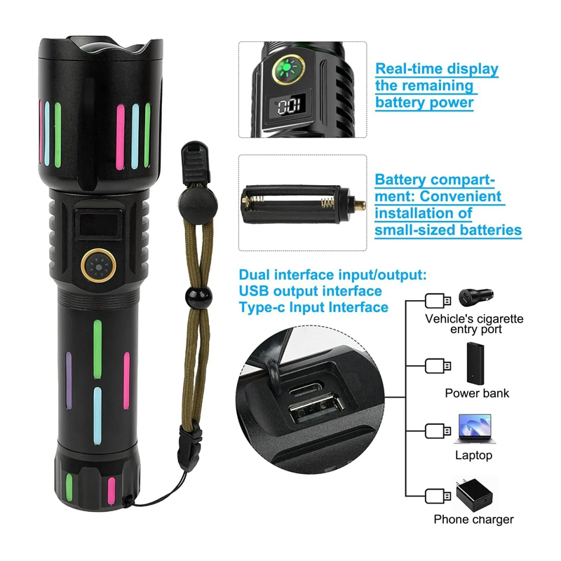 Επαναφορτιζόμενοι φακοί με ψηφιακή οθόνη LCD: Εξοπλισμένος με πρόσφατα αναβαθμισμένη οθόνη ισχύος LCD για εύκολη κατανόηση της υπολειπόμενης ισχύος. Διαθέτει θύρα εισόδου τύπου C και έξοδο USB που επιτρέπει τη χρήση του ως power bank για φόρτιση άλλων συσκευών.