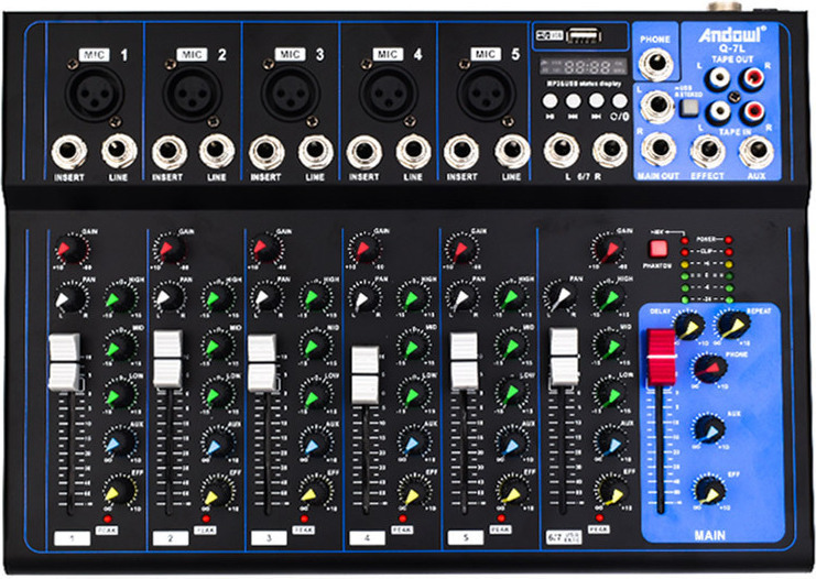 Αναβαθμίστε τον ήχο σας με την Andowl Q-7L, μια ευέλικτη αναλογική κονσόλα 7 καναλιών. Διαθέτει 5 εισόδους XLR με 48V Phantom Power για πυκνωτικά μικρόφωνα, ενσωματωμένο Bluetooth, θύρα USB για MP3 και ψηφιακά εφέ καθυστέρησης (Delay). Με EQ 3 περιοχών ανά κανάλι και στιβαρή σχεδίαση, είναι ιδανική για live εμφανίσεις, podcasts, μικρά studio και εκδηλώσεις.