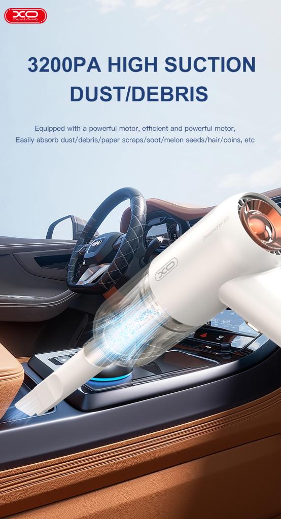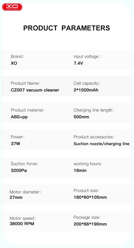 Η XO CZ007 είναι μια ασύρματη ηλεκτρική σκούπα αυτοκινήτου για μικρές εργασίες κατά τον καθαρισμό του αυτοκινήτου με μέγιστη ισχύ 37 W. Μαζί με την ηλεκτρική σκούπα περιλαμβάνεται ένα καλώδιο φόρτισης 5 μέτρων και μια πρόσθετη μύτη επέκτασης για τον καθαρισμό κάθε γωνιάς και σχισμής του αυτοκινήτου.