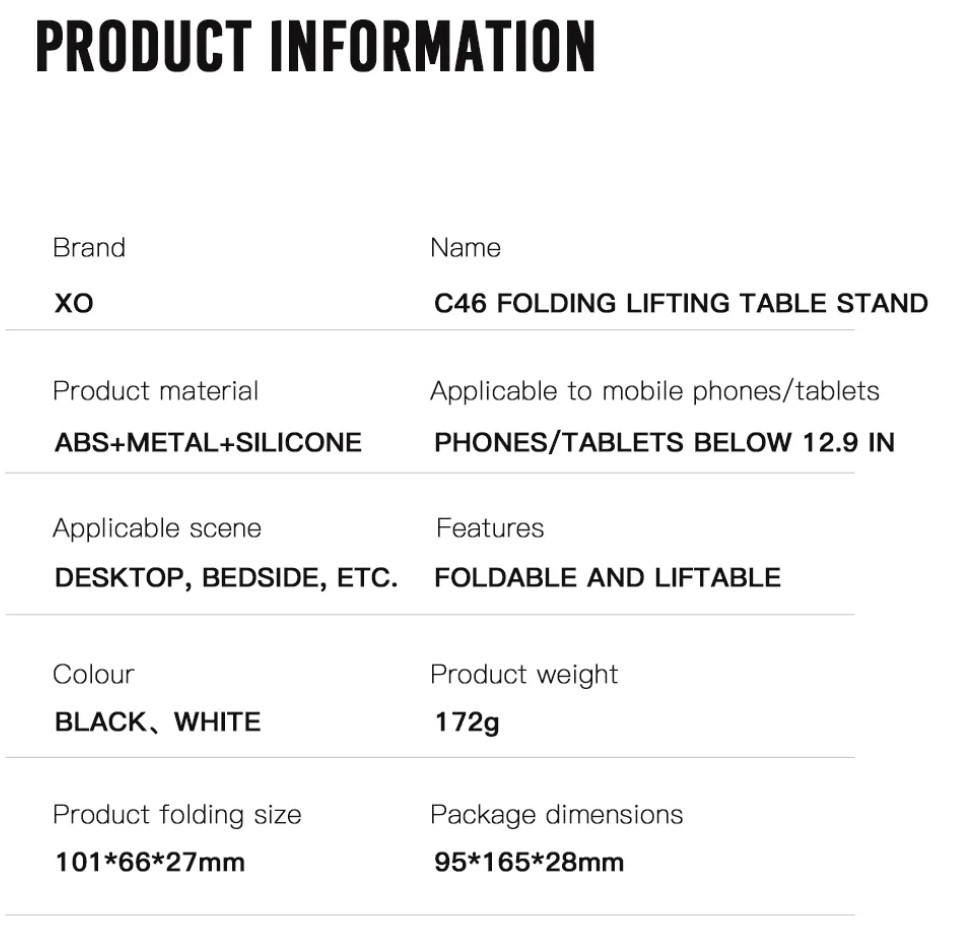 Όνομα :C46 πτυσσόμενο και ανυψωτικό στάντΥλικό προϊόντος: ABS+METAL+SILICONE Ισχύει για κινητά τηλέφωνα/tabletΒάρος προϊόντος: 172g