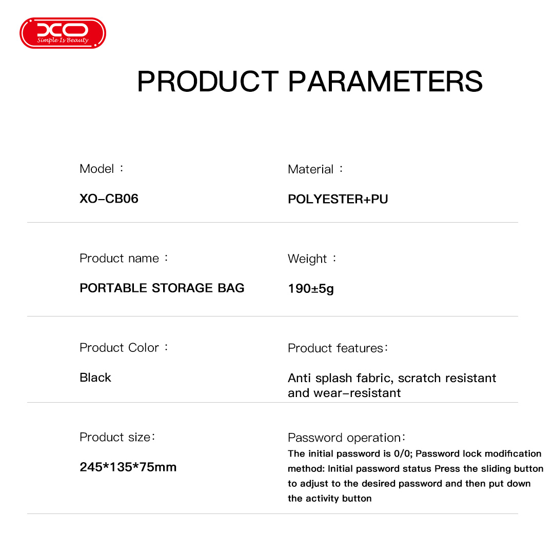 Η φορητή τσάντα αποθήκευσης XO-CB06 είναι ένα προϊόν υψηλής ποιότητας κατασκευασμένο από συνδυασμό υλικών πολυεστέρα και PU.Αυτή η ελαφριά τσάντα έχει σχεδιαστεί για να παρέχει άνετη αποθήκευση εν κινήσει. Το ύφασμα κατά των πιτσιλιών διασφαλίζει ότι τα υπάρχοντά σας παραμένουν προστατευμένα από ζημιές και από το νερό, ενώ μάλιστα είναι ανθεκτικό στις γρατσουνιές και έχει αντοχή στη φθορά εγγυώνται μακροχρόνια αντοχή.Διαθέτει επίσης κλειδαριά με κωδικό πρόσβασης για πρόσθετη ασφάλεια. Ο αρχικός κωδικός πρόσβασης έχει οριστεί σε 0/0 και μπορείτε εύκολα να τον τροποποιήσετε ακολουθώντας μια απλή διαδικασία. Απλώς προσαρμόστε το συρόμενο κουμπί στον επιθυμητό κωδικό πρόσβασης και, στη συνέχεια, αφήστε το κουμπί.