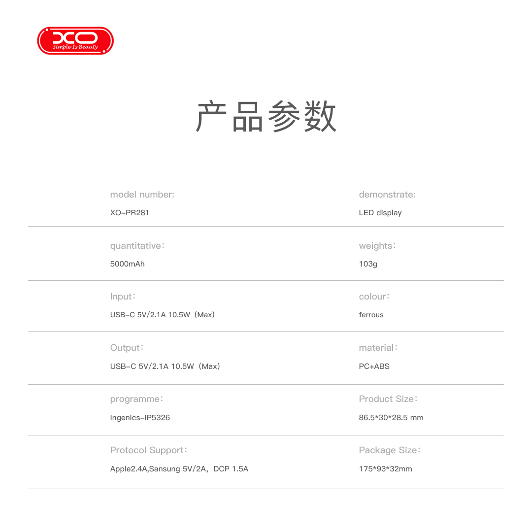 XO PR281 Mini Powerbank 5000mAh με Ενσωματωμένο Φακό και Καλώδιο Φόρτισης iP