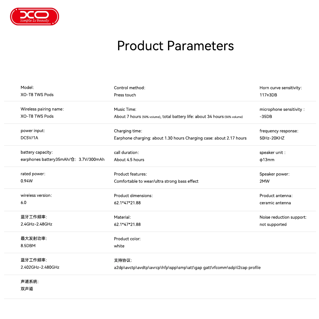 Λεπτομέρειες ΠροϊόντοςBluetooth έκδοση 6.0Υψηλής ευκρίνειας ηχείο πλήρους φάσματος Φ13mmΜπαταρία ακουστικού: 35mAh*2Μπαταρία θήκης φόρτισης: 300mAhΧρόνος αναπαραγωγής ακουστικού: Περίπου 8 ώρεςΣυνολική διάρκεια μπαταρίας: Περίπου 32 ώρεςΕύρος λειτουργίας: ≥10mΒαθμός αντοχής στο νερό: IPX4Κύρια ΧαρακτηριστικάΑκουστικά τύπου in-ear TWSΝεότερος σχεδιασμός 8ης γενιάςΙσχυρή ποιότητα ήχουΆνετη εφαρμογή